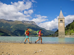 Kurze Busfahrt am Reschensee mit Blick auf die versunkene Kirche von Graun zum Tourenstart. Eine Wanderung im Naturschutzgebiet am Haidersee führt Sie ins idyllische Fischgadermoos und über den Bergsee hinab in den Sennereiort Burgeis. Über abwechslungsreiche Wiesen- und Waalwege nach Schluderns und per Bahn durch Wein- und Apfelgärten nach Naturns, das Tor zur beeindruckenden Texelgruppe.