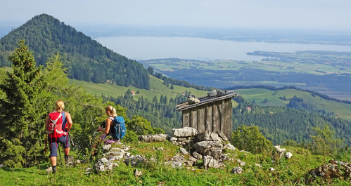 Kurze Bergfahrt, anschließend wandern Sie durch den Wald bergauf zu den Almen der Hochplatte und zur Kampenwand, wo Sie den Chiemsee in Sichtweite haben. Weiter folgen Sie dem Wanderweg von Hütte zu Hütte unterhalb der Kampenwand, deren felsgekrönten Gipfel ein 12 m hohes eisernes Kreuz schmückt. Talwärts geht es gemütlich mit der Seilbahn nach Aschau, von wo Sie in kurzer Bahnfahrt den Chiemsee erreichen.
