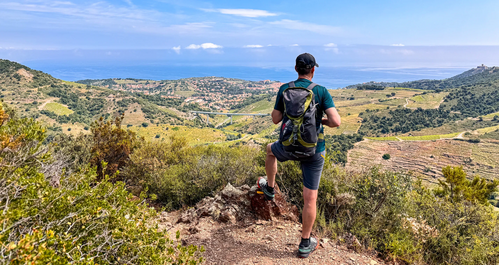 Der Wanderweg schlängelt sich wieder hinauf durch die Weingärten zu den grün bewachsenen Bergkämmen. Mit traumhaften Ausblicken auf Küste und Berggipfel führt Ihre Route am Puig Joan vorbei zum „Tour de Querroig“, ein stolzer Grenzgipfel mit Überresten eines Signalturms. Der Abstieg erfolgt nun auf die spanische Seite der Küste in Richtung Cerbère.