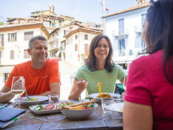 Durch lichte Haselnusshaine und wilde Wälder führt die heutige Route ins zauberhaft gelegene Monforte d´Alba. Schon von weitem sind der imposante Glockenturm und der Palast Scarampi zu erkennen. Das mittelalterliche Monforte lädt zur Erkundungstour durch die verwinkelten Gassen und zu einem Imbiss in den zahlreichen Restaurants und Vinotheken. Mit verzückendem Ausblick ins Tal wandern Sie in den weltberühmten Weinort Barolo, wo Sie mit einer Verkostung der edlen Weine belohnt werden.